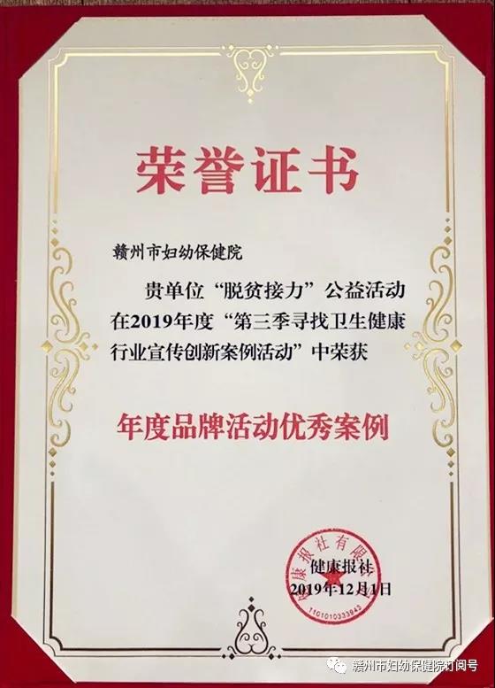 本站讯  周小梅报道:近日,由健康报社主办的第三届全国卫生健康品牌传播年会暨第三季寻找卫生健康行业宣传创新案例活动总结会在四川成都召开。会上对2019年度“第三季寻找卫生健康行业宣传创新案例活动”系列评选结果予以表彰,赣州市妇幼保健院“脱贫接力”公益活动被评为品牌活动类“年度品牌活动优秀案例”。