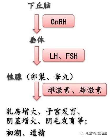 无忧无虑的童年,在某一天下丘脑里面的一个神秘的开关(性启动装置)忽然开启了。接着一浪高过一浪的荷尔蒙(激素)不断得冲刷着幼稚的身体。身体开始发生巨大的变化:女生发现乳房增大、硬结,继而出现阴毛,月经来潮等等;男生发现自己有阴毛,出现声音低沉,长出胡须,遗精等等。伴随着身体出现的巨大变化,心理也产生了巨大的反应:敏感而冲动。这种身、心的巨大变化,常常让人们感觉青春期特别神秘。其实青春期并不神秘。咱们老祖宗就有对青春期的描述,认为肾气旺盛,促进生殖功能成熟。《黄帝内经》有云:“女子七岁,肾气盛,齿更发长;二七而天葵至,任脉通,月事以时下,故有子......”意思就是女孩到了七岁,肾气渐渐充盛,乳牙开始更换,头发不断生长;到了十四岁,形体发育丰满,性机能成熟,子宫卵巢发育渐成熟,性激素水平升高,月经来潮,具有生育功能。男性则为:“丈夫八岁,肾气实,发长齿更;二八肾气盛,天葵至,精气溢泻,阴阳和,故能有子......”就是说:男孩到了八岁,肾气开始充实,头发生长,乳牙更换,到了十六岁,肾气旺盛,生殖功能成熟,精液充满而遗精,如果两性交合,可以生育子女。以上是我们古人对青春期的朴素描述。我从儿童内分泌的角度和大家一起谈谈青春期。青春期是性成熟的过程。通俗地说就是小孩变成大人的这个过程。简单地说,首先是下丘脑分泌一些神经肽、细胞因子和激素(主要是GnRH)等作用于脑垂体,脑垂体分泌促性腺激素(主要是LH和FSH),然后作用于性器官(卵巢、睾丸等)的发育成熟。这个过程就是青春期。(GnRH:促性腺激素释放激素,LH:促黄体生成素,FSH:促卵泡生成素)还是听不太懂?好嘛,这样说吧:青春发育≈下丘脑→垂体→性器官(引起青春发育的激素来自:下丘脑-垂体-性腺轴和肾上腺)