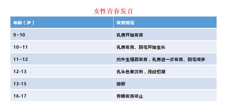 上面说得这么简单都是为了让大家有一个大概的认识。其实青春期是在中枢神经系统控制下的一个精细而复杂的神经内分泌系统工程。青春发育是受种族、遗传、生活环境和营养因素等影响。通常女孩是9-10岁开始发育,男孩则是10-11岁开始发育。当然个体差异也很大,每一个体的青春期开始年龄、发育速度和结束年龄都有各自的规律。青春期性发育遵循一定的规律:女孩:乳房发育、阴毛、外生殖器的改变、月经来潮、腋毛。整个过程约:1.5-6年,平均4年发育成熟。