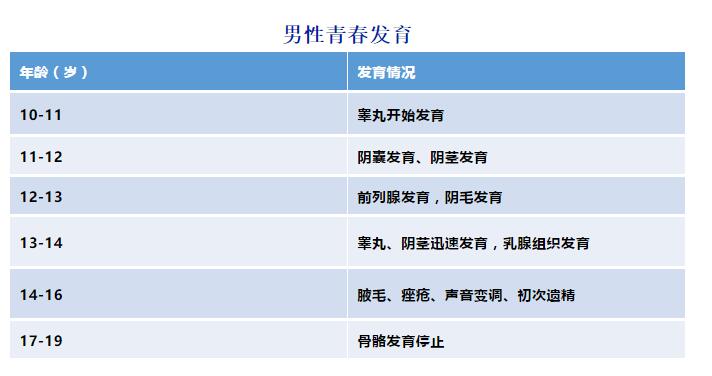 男孩:睾丸增大、阴茎增粗增长、阴毛、腋毛、声音低沉、胡须等。一般要5年以上发育成熟。