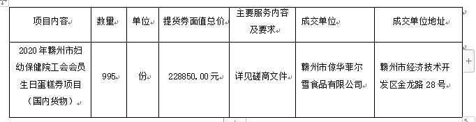 中韵联合集团股份有限公司受赣州市妇幼保健院的委托,就其2020年赣州市妇幼保健院工会会员生日蛋糕券项目(项目编号:ZYLH2019-GZ-ZY003-1)按照规定进行了磋商,采购活动于2019年12月16日下午15:00(北京时间)在中韵联合集团股份有限公司开标室举行。经磋商小组评定和采购人确认,成交结果如下: