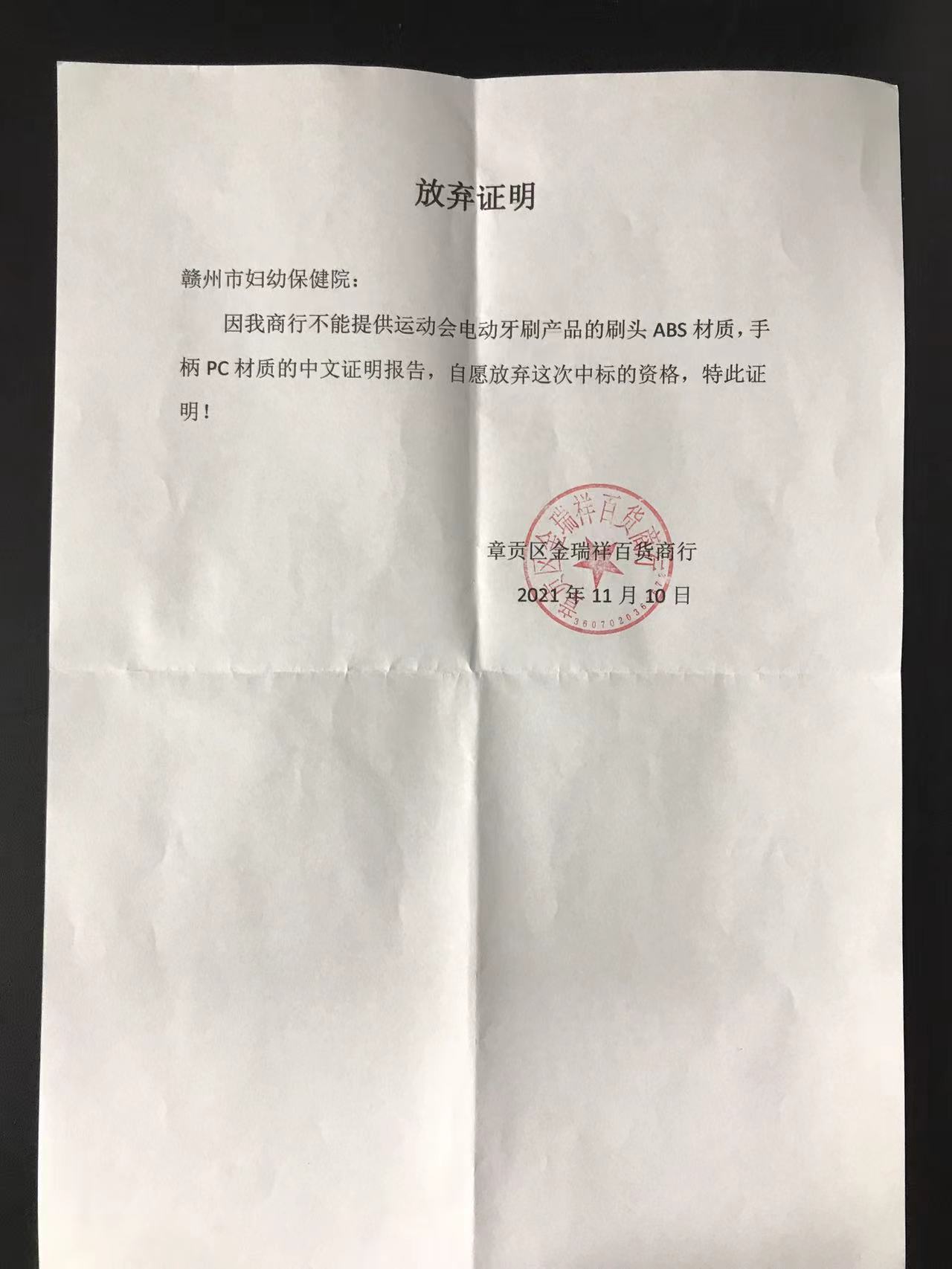 赣州市妇幼保健院新院就运动会纪念品电动牙刷项目(项目编号:GZFB2021-KF-0015)按照规定进行了竞争性谈判采购,采购活动于2021年11月3日15时00分(北京时间)在赣州市妇幼保健院行政楼2楼会议室举行,并于2021年11月5日发布成交结果公示。