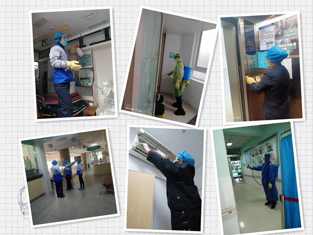 在克服最初紧张害怕的情绪后,保洁员们全部坚守岗位,按照医院要求,对重点科室重点部位、公共区域进行清洗消毒;对电梯、台面、桌椅等擦拭消毒。隔离病区、发热门诊、楼道口、电梯旁,随处可见他们忙碌的身影。